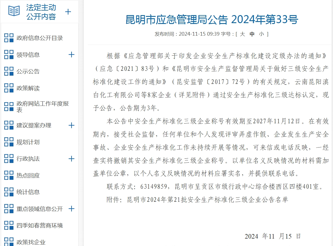 11月15日,昆明市應急管理局印發(fā)公告,公布昆明市2024年第21批安全生產(chǎn)標準化三級企業(yè)公告名單,8家企業(yè)榜上有名。其中,國藥集團昆明血液制品有限公司(以下簡(jiǎn)稱(chēng)“昆明血制”)順利獲評“醫藥行業(yè)安全生產(chǎn)標準化三級企業(yè)”。