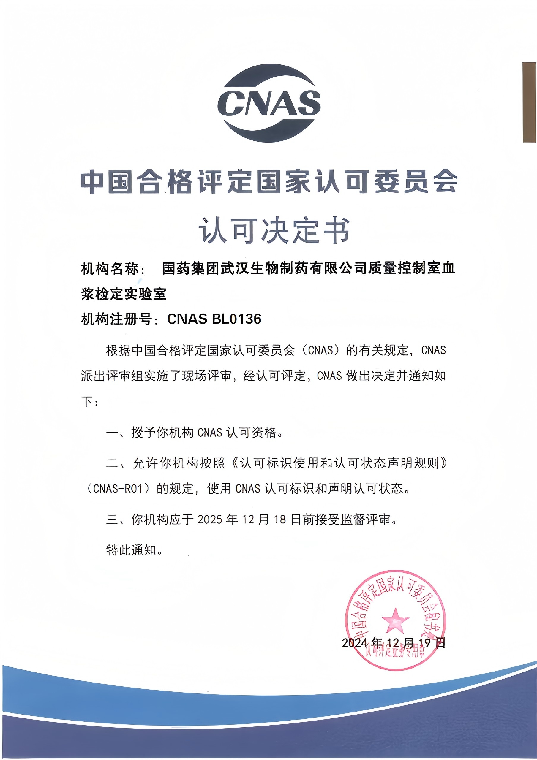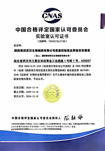 12月19日,國藥集團武漢生物制藥有限公司(以下簡(jiǎn)稱(chēng)“武漢生物制藥”)質(zhì)量控制室血漿檢定實(shí)驗室正式通過(guò)中國合格評定國家認可委員會(huì )(CNAS)評審,成為國內首家血液制品生產(chǎn)企業(yè)中通過(guò)CNAS-CL05:2009體系認可的實(shí)驗室。